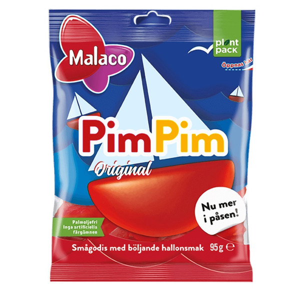 Malaco PimPim are small, boat shaped raspberry gummies with a soft and chewy texture. The flavor is rich and fruity without being too sweet. These simple, one color pieces have a smooth surface and a taste that has stayed the same since they first launched!