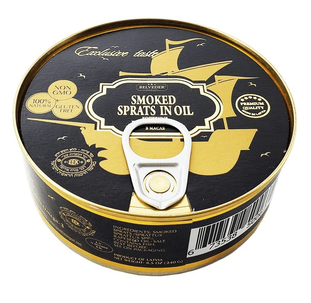 Belveder Riga Smoked Sprats in Oil are a Latvian delicacy that have been smoked over wood until a golden color is achieved. These sardine-like fish are naturally rich in Omega-3 and have been wild caught and hand packed.