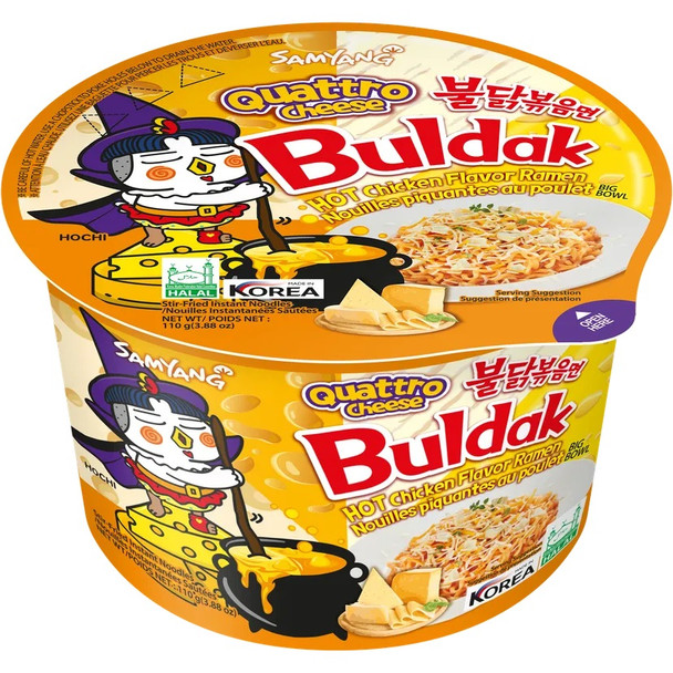 SAMYANG Buldak Hot Chicken Ramen Cheese Big Bowl delivers the same addictive fiery kick of the original Buldak, enhanced with a creamy cheese flavor for a milder yet richer taste. Ideal for those who enjoy spicy food with a smooth, comforting finish, this big bowl format is quick and easy to prepare anywhere. Simply add hot water, mix in the seasoning, and enjoy a bold Korean-style spicy noodle experience!
