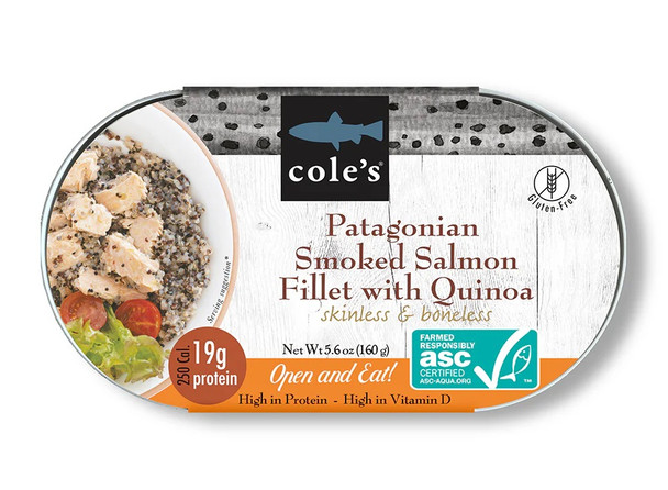 Cole’s skinless, boneless, ASC®-certified Salmon Fillet with Quinoa is sustainably raised in the pristine waters of Patagonia. The salmon is then Applewood-smoked, hand-packed with the highest quality ingredients, and flavored with a traditional Chilean spice blend.